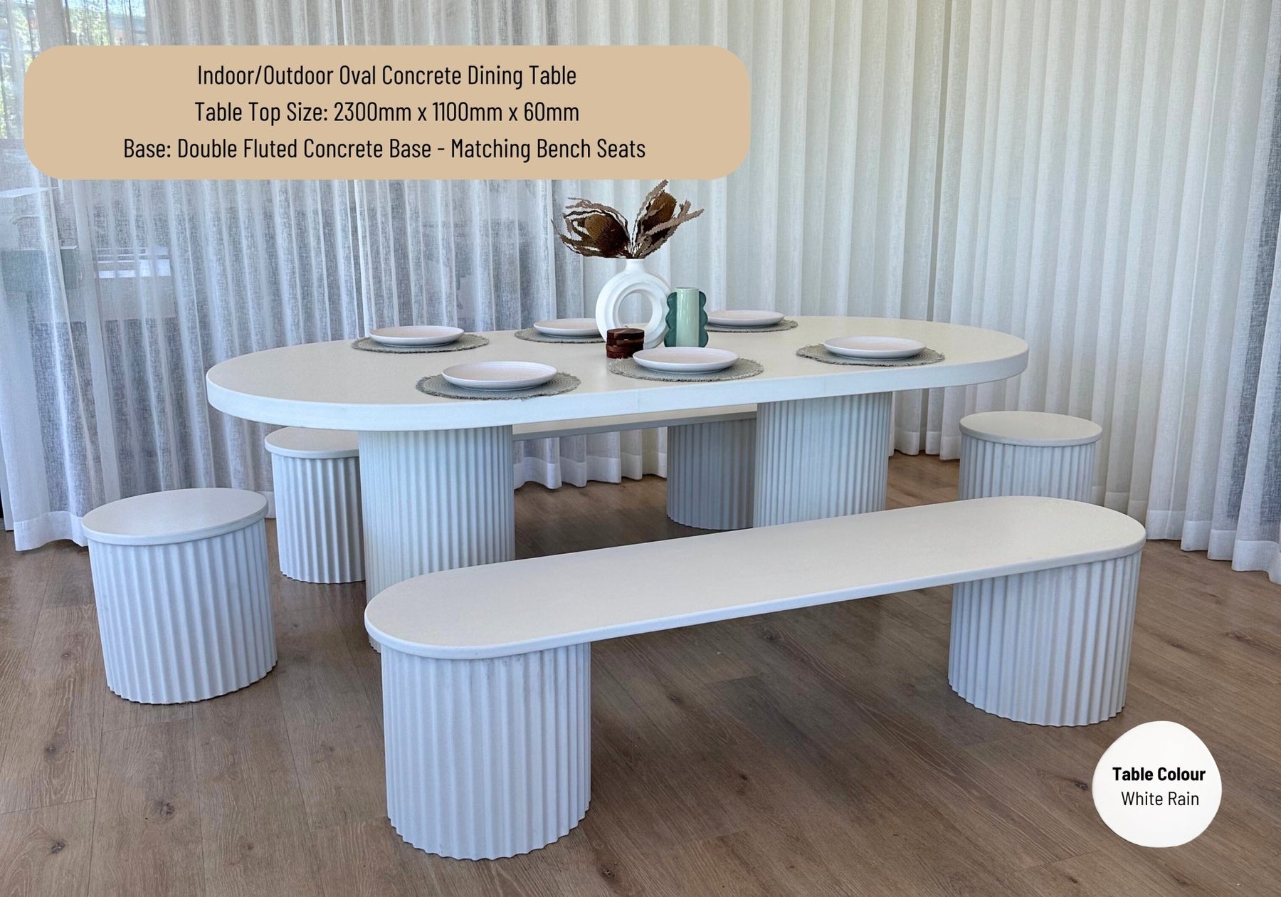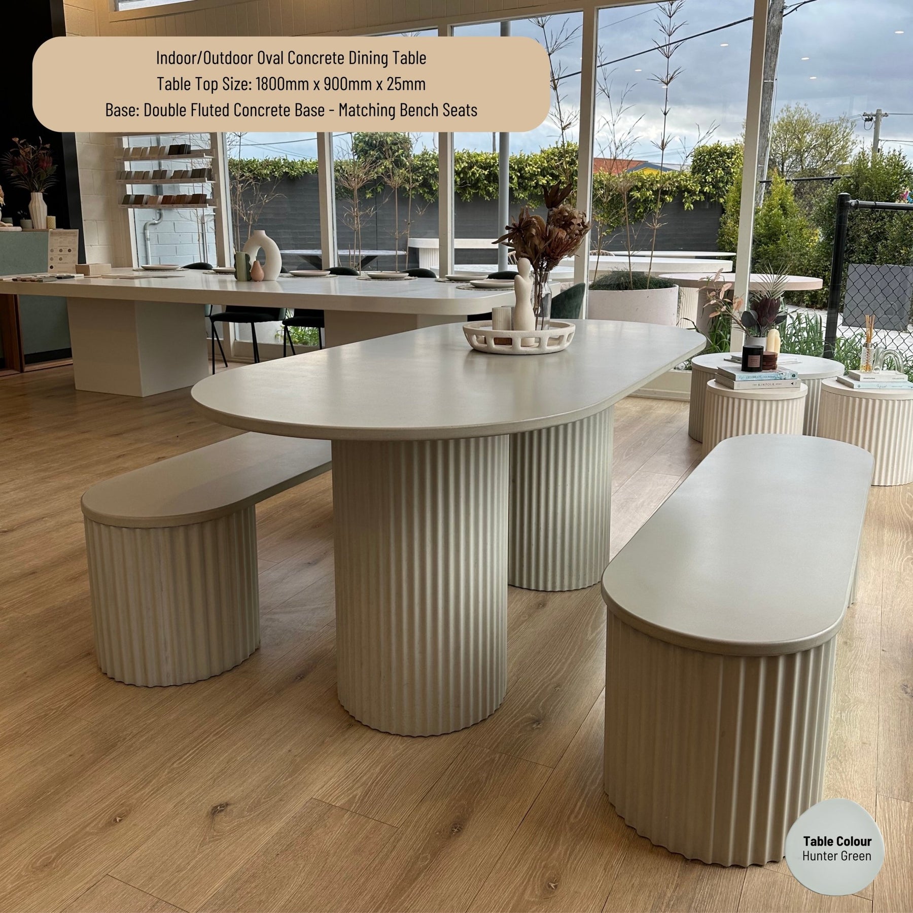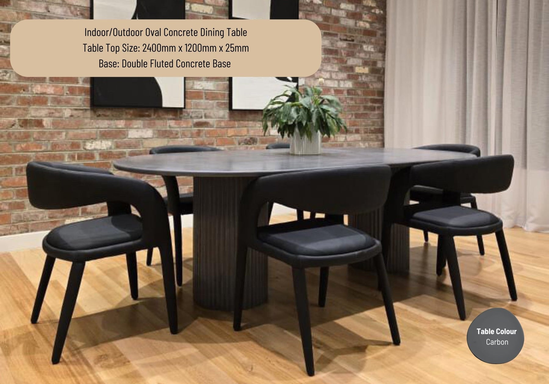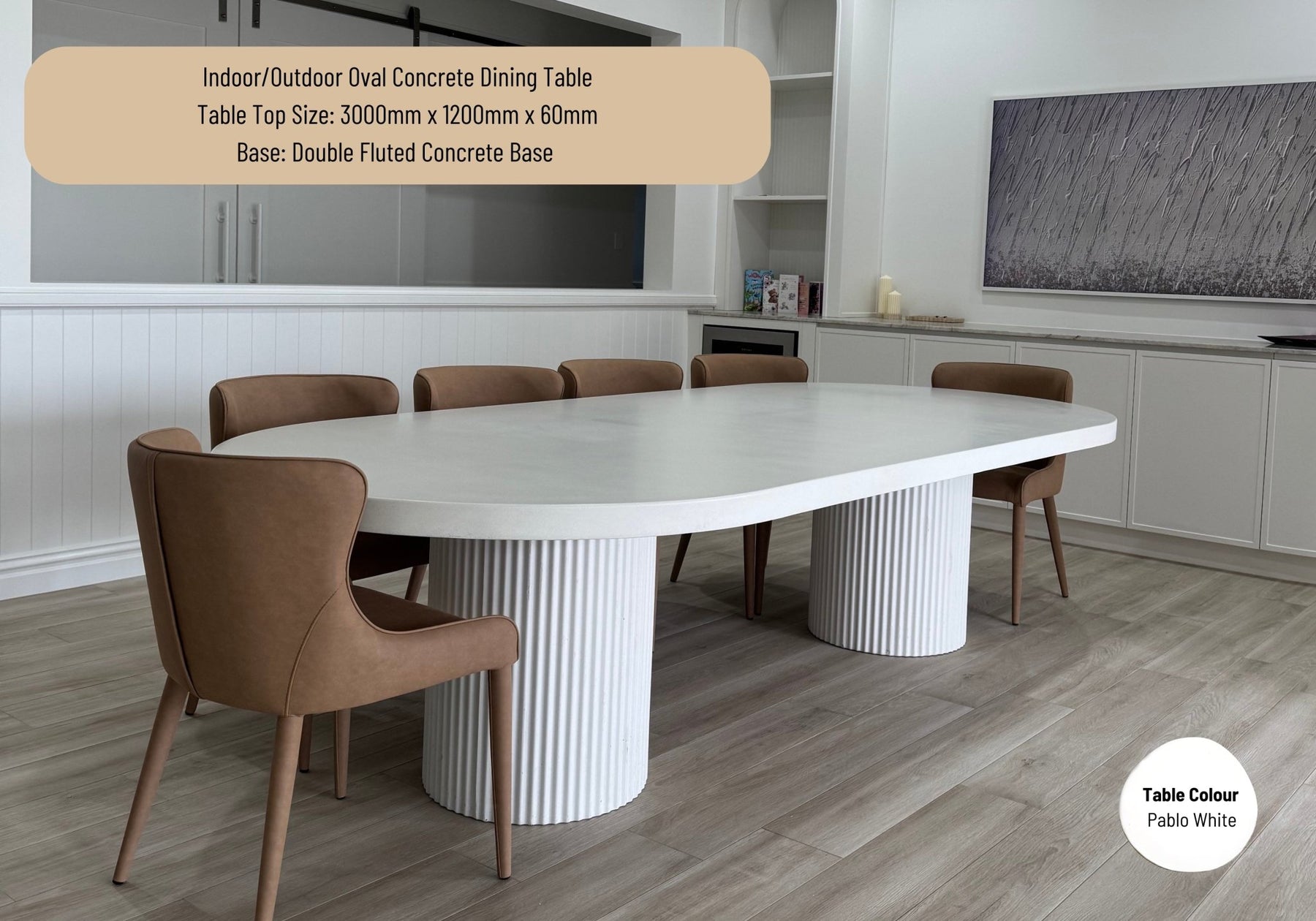 Our Indoor or Outdoor Oval Concrete Dining Table is defined by its signature double fluted concrete pedestal bases. These are meticulously hand-cast columns elevating the table from functional furniture to a true design statement.