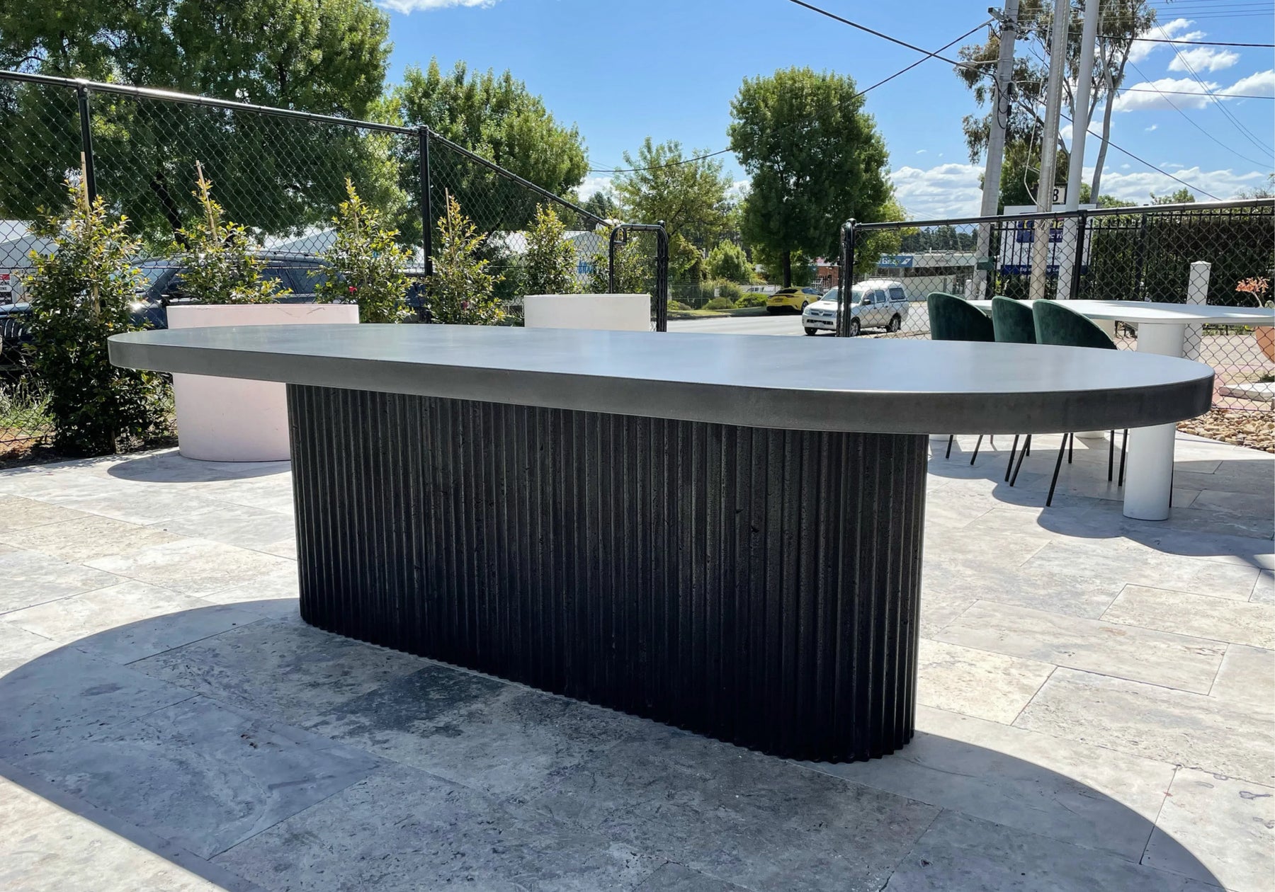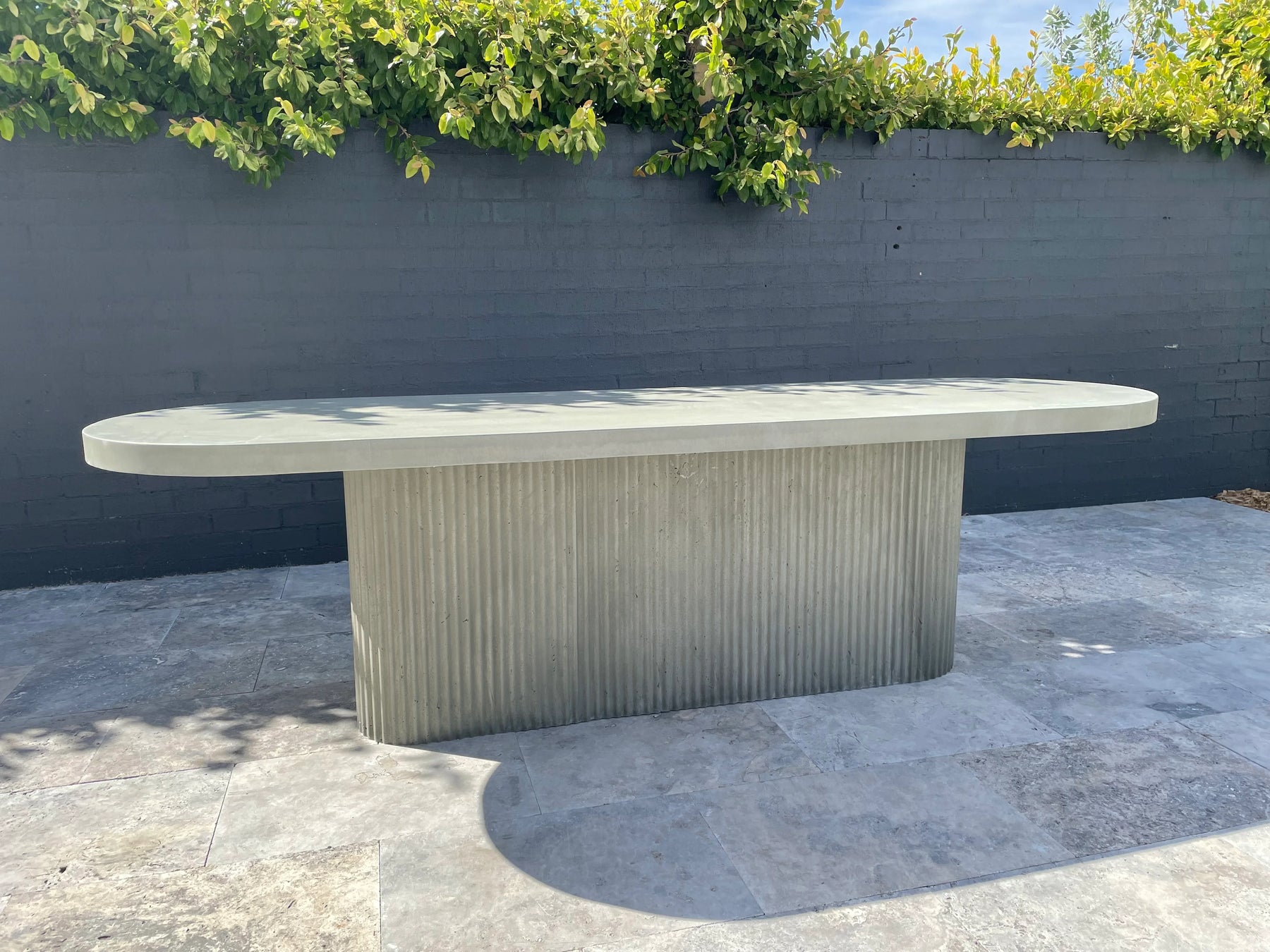 Regular price $7,000.00 Save Liquid error (snippets/product-template line 160): Computation results in '-Infinity'%Showcasing our Indoor or Outdoor Oval Concrete Dining Table Top paired with our Fluted Single Concrete Base.