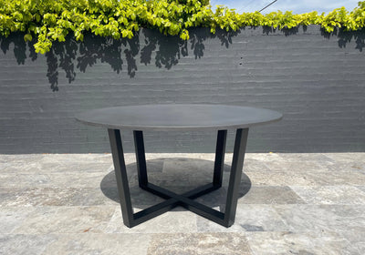Showcasing our Indoor/Outdoor Round Concrete Dining Table Top paired with our Black or White Powder Coated Steel Kingston Base.