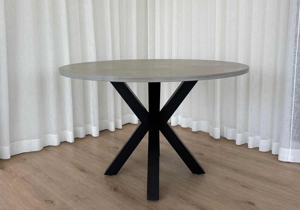Regular price $2,850.00 Save Liquid error (snippets/product-template line 160): Computation results in '-Infinity'%Showcasing our Indoor/Outdoor Round Concrete Dining Table Top paired with our Black or White Powder Coated Steel Spider Base.