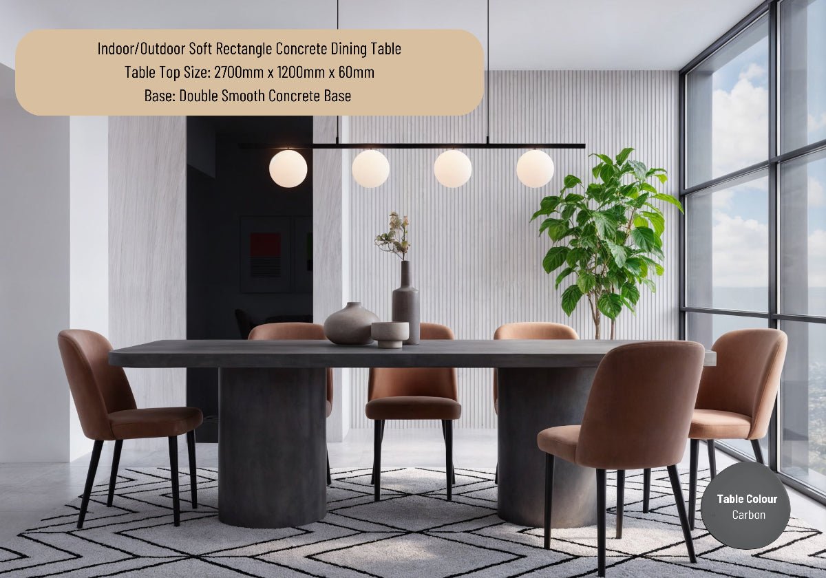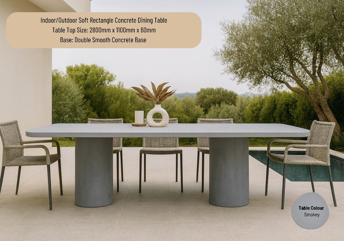 Our Indoor or Outdoor Soft Rectangle Concrete Dining Table with our Double Smooth Concrete Base is where strength meets subtle softness. Crafted from hand-made concrete, its rectangular form is refined with generous 200mm radius corners — creating a silhouette that feels both architectural and inviting.