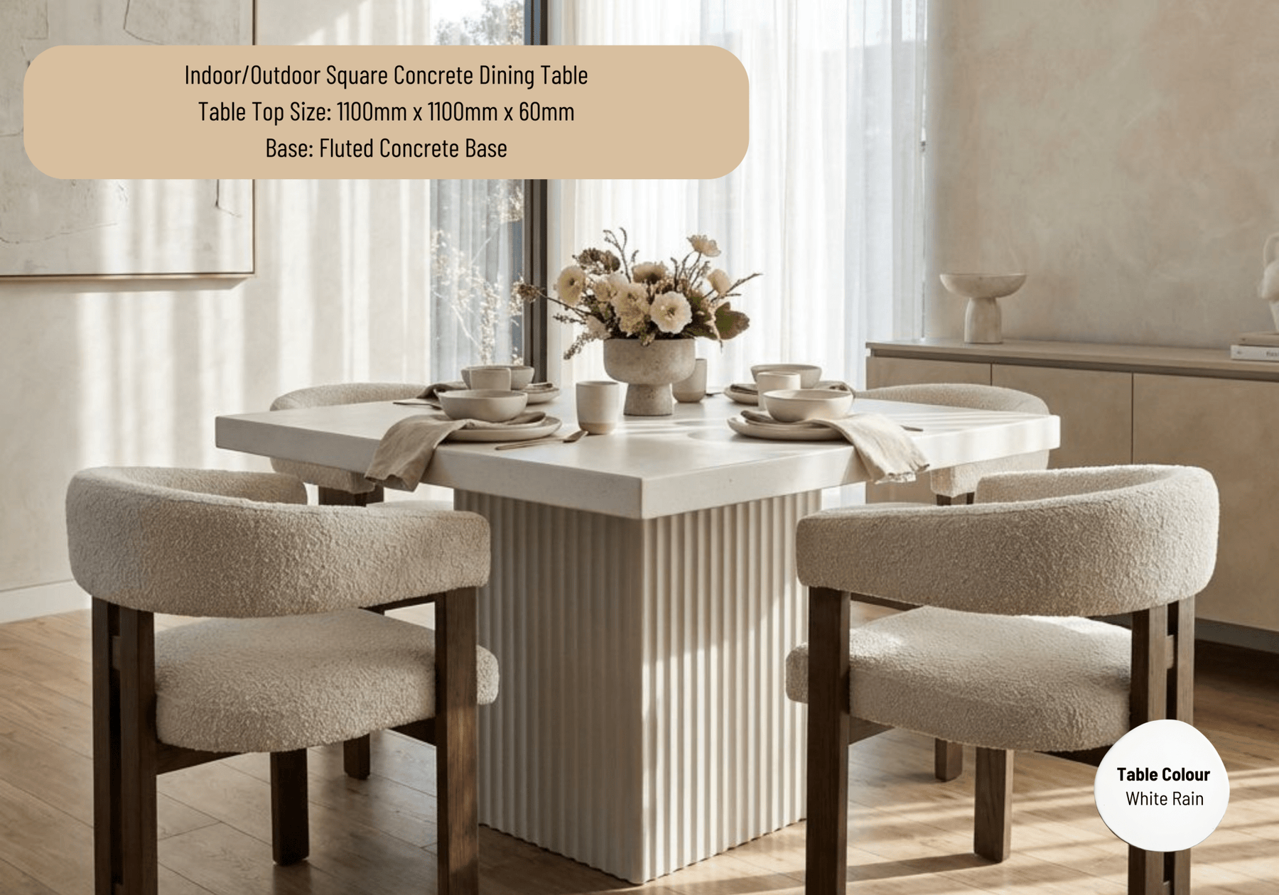 - Table Top Material: Glass Fibre Reinforced Concrete (GFRC) handmade in Canberra