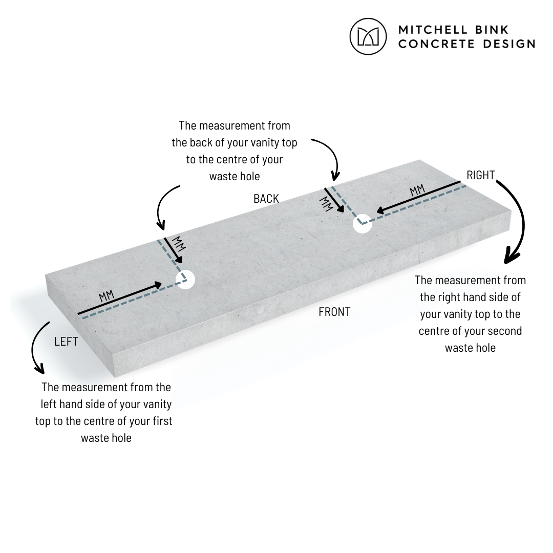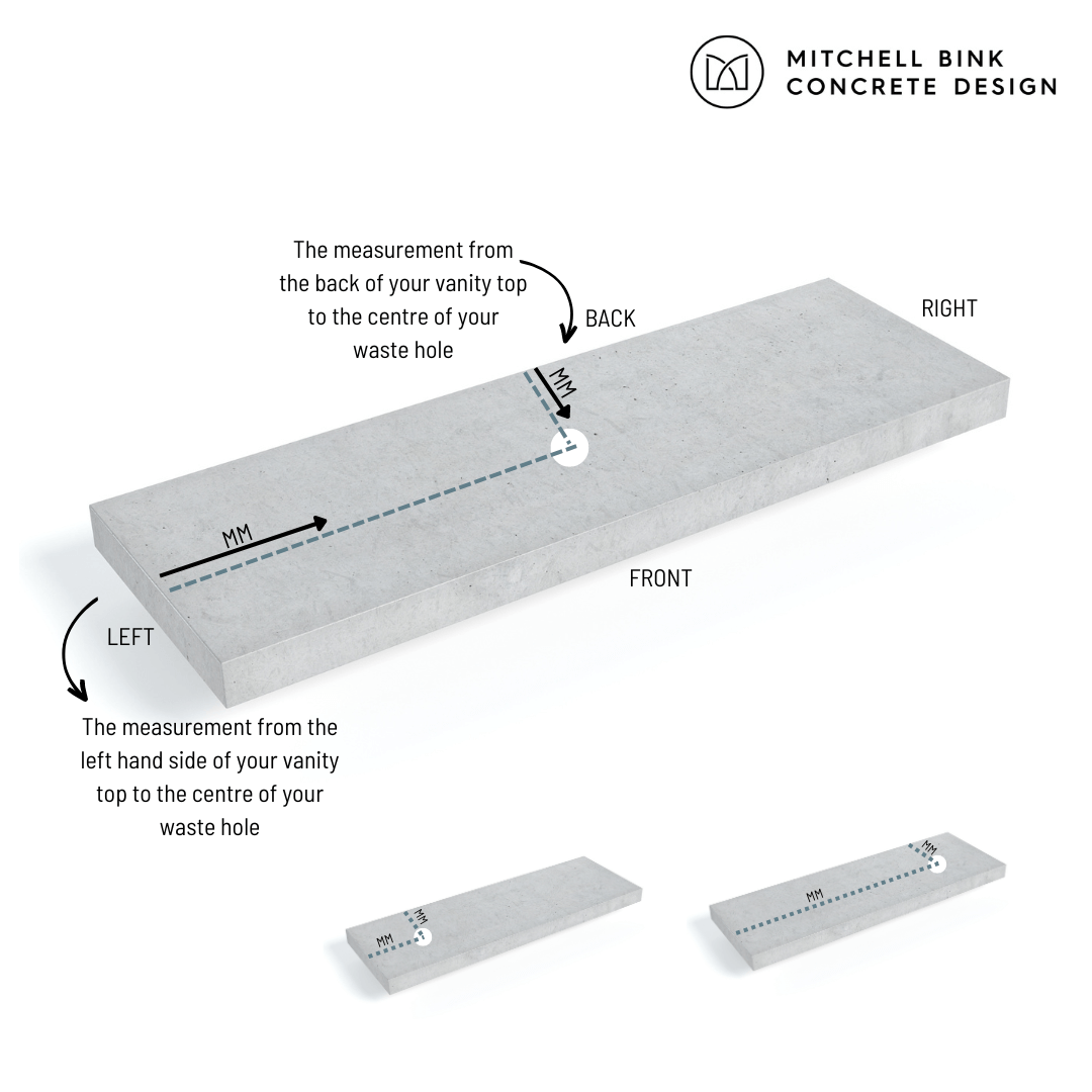 We will drill the waste hole/s exactly where you need them and we do this after we make your Concrete Bathroom Vanity Top. Click on “Order Now” above and you will be asked to provide us with this information. If you don’t know it yet, that’s totally fine, we just need to know this information prior to dispatch, it doesn’t delay us making your Concrete Bathroom Vanity Top.