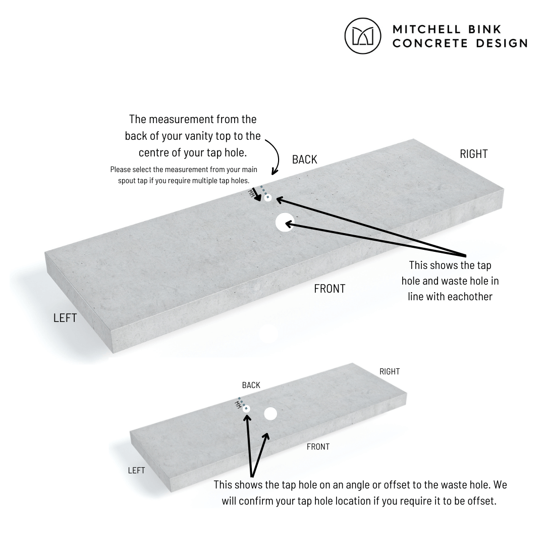 No problem – click on “Order Now” above and you will be asked to provide us with this information. If you don’t know the tap location yet or haven't selected your taps yet, that’s totally fine, we just need to know this information prior to dispatch. It doesn’t delay us making your Concrete Bathroom Vanity Top.