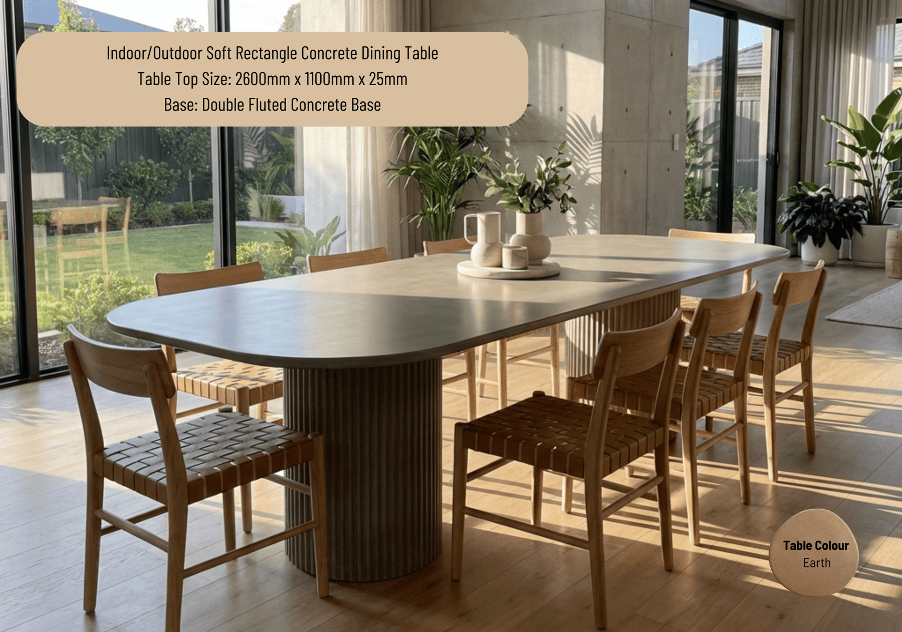 Regular price $5,290.00 Save Liquid error (snippets/product-template line 160): Computation results in '-Infinity'%Our Indoor or Outdoor Soft Rectangle Concrete Dining Table with our Double Fluted Concrete Base is where strength meets subtle softness. Crafted from hand-cast concrete, its rectangular form is refined with generous 200mm radius corners — creating a silhouette that feels both architectural and inviting.