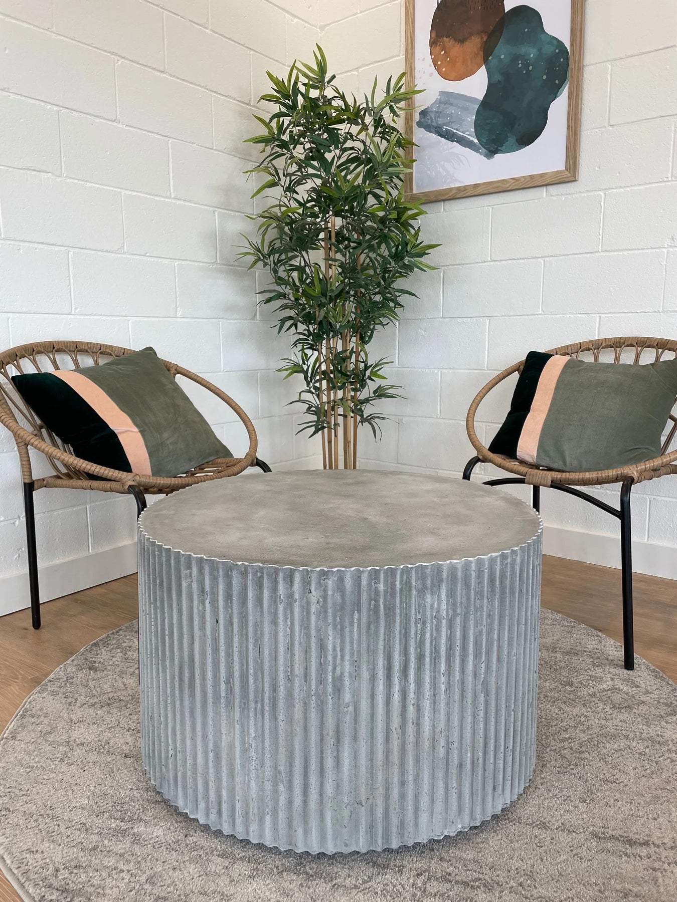 Regular price $1,700.00 Save Liquid error (snippets/product-template line 160): Computation results in '-Infinity'%Showcasing our Indoor or Outdoor Round Concrete Coffee Table in our Fluted finish.
